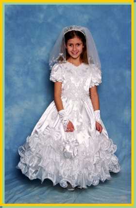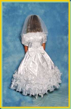 A richly embroidered, full length dress, with a wealth of pearl beading extending across the bodice, skirt and sleeves. In rich satin, this dress is adorned with a frilled skirt rising to a multi-tiered waterfall at the back. A large embroidered and pearl edged bow with tails completes the elaborate styling. The dress is fully lined and the underskirt is netted. Material: 100% polyester satin Sizes available: 6, 8, 10, 12 Price: £99 |