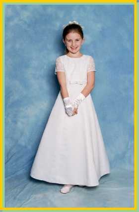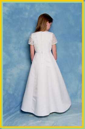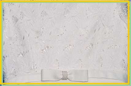 An elegant, slim fitting, A-line, full length dress in duchess satin, with an embroidered lace bodice and sleeves. The centre front of the bodice edge features a small pearl encrusted bow. The dress is fully lined and the underskirt is netted. Material: 100% polyester duchess satin Sizes available: 6, 8, 10 Price: £69 |