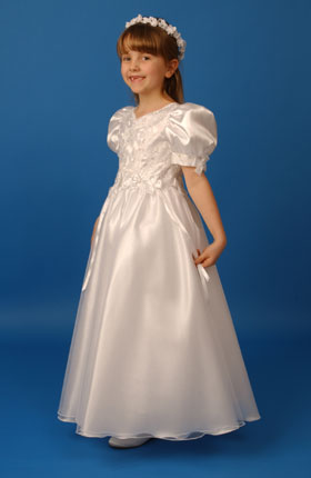 A pretty full-length dress with embroidered bodice and net skirt. Four satin circular flowers with long satin ribbons are placed at the waist in the front and back. The dress is fully lined and the underskirt is netted.