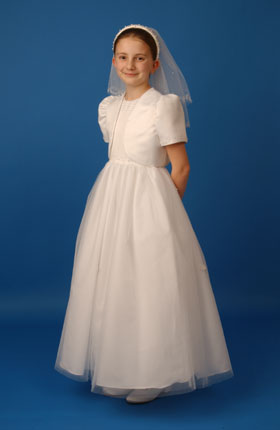 This simple, sleeveless, full length dress comes with a matching jacket. The duchess satin bodice features pearl beading at the neck and waist and the tulle skirt is scattered with small appliqués. The duchess satin bolero jacket is plain, with simple beading at the base of the sleeves. Both dress and jacket are fully lined and the underskirt is netted.