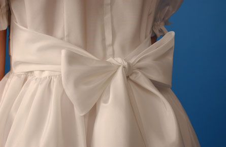 A full length, simply styled and attractive dress in taffeta. The bodice and sleeves are gently sequinned and the neck trimmed with pearls. It has a full skirt and fixed pleated cummerbund with tie up sash. The dress is fully lined and the underskirt is netted.