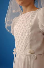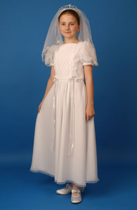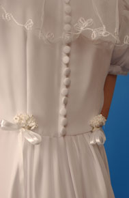 An elegant, flattering full length dress in attractive georgette. The bodice centre panel is criss-crossed with tiny pleats and small velvet flowers and there are posies of small flowers with long ribbon streamers at the waist, front and back. The zip flap is lined with covered buttons and the sleeves are edged with ribbon. The dress is fully lined.