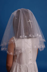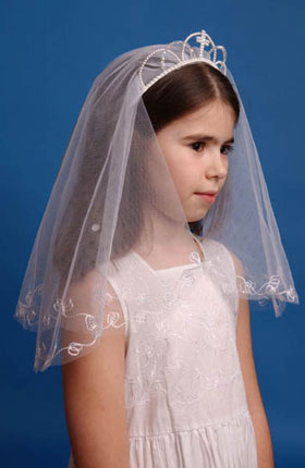 Pearl loops and crystal tiara, with attached 36" veil, with pearl cross and scattered mother of pearl sequins.
