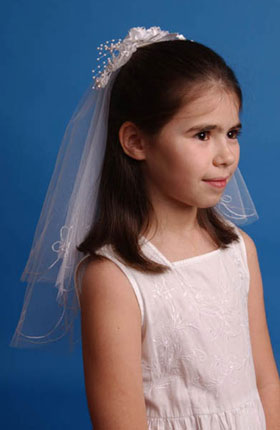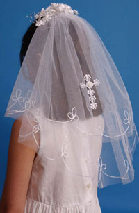 Flower and pearl spray with comb. Attached 36" veil has embroidered cross with diamante centre.