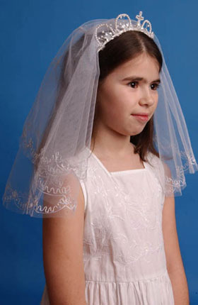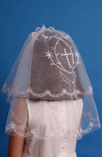 Pearl loops, flowers and diamante tiara, with attached 36" embroidered veil with pearl cross.