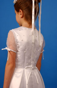 This simply styled, ¾ length dress is very attractive. The bodice is overlaid with organza and fine pearl beading and the duchess satin skirt has two pleats in the front and back. The organza sleeves have a satin bow at the base, which matches the satin bow at the back of the waist. The underskirt is netted and the dress is fully lined.