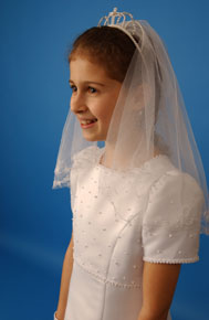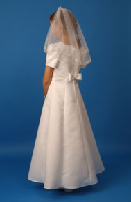This full length, slim fitting, A-line, duchess satin dress is excellent value. It has a pearl spotted bodice and cap sleeves and the square neck and high waist are trimmed with a row of pearls. The back features a small pearl spotted bow at the centre waist. The dress is fully lined and the underskirt is netted.