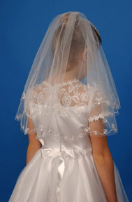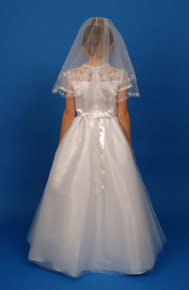 This full length dress in satin and tulle is very attractive. The top of the bodice is trimmed in embroidered lace and the full skirt is made of the finest tulle. The waist is elasticated at the back and covered with a thin satin ribbon which ties into a soft bow. The dress is fully lined and the underskirt is netted.