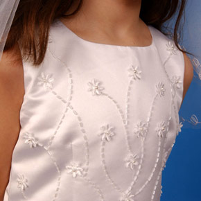 A pretty sleeveless, full length, A-line dress, with an embroidered bodice, front and back. The dress is fully lined and the underskirt is netted.