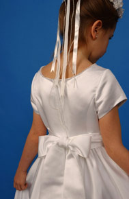 A pretty satin dress with a long, tie-up sash. The scooped neck is edged with pearls and pearls are scattered on the bodice and skirt. The dress is fully lined and the underskirt is netted. Cherry is pictured in 3/4 length - these have now sold out. The remaining available sizes are for the full length version.