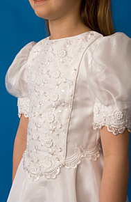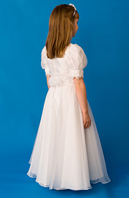 An elegant, full length dress in soft organza, with a slim fitting bodice and flowing circular skirt. The centre panel of the bodice is delicately embroidered and scattered with pearls and the puff sleeves are edged with matching embroidered cuffs. The waist is gently v-shaped in the front. The zip flap is covered with a long line of pearl buttons and finishes with small organza rosettes at the waist. The dress is fully lined.