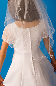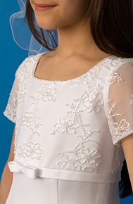 An elegant, simply styled, empire-line dress with a beautifully embroidered bodice and sleeves. The back zip is covered with satin buttons and the underskirt is softly netted. This duchess satin dress is fully lined.